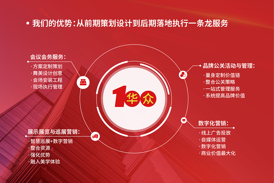 華眾傳媒集團(tuán)是在大數(shù)據(jù)網(wǎng)絡(luò)和新消費(fèi)交互時(shí)代為企業(yè)及其品牌全面賦能的營(yíng)銷戰(zhàn)略公關(guān)公司。華眾傳媒集團(tuán)成立于2006年,總部設(shè)在青島,在北京、上海、廣州建立分公司,公司云集數(shù)百名公關(guān)、數(shù)字、營(yíng)銷、設(shè)計(jì)等業(yè)界精英人才,旗下隸屬分公司有:北京華友世紀(jì)文化傳媒有限公司、上海天諾盛世廣告策劃有限公司和青島華和影視文化傳媒有限公司等多家子公司。公司積累了豐富的數(shù)字媒體、政府、時(shí)尚、圈層KOL等行業(yè)資源,服務(wù)項(xiàng)目輻射全國(guó)。業(yè)務(wù)范圍包含品牌公關(guān)活動(dòng)與管理、數(shù)字化營(yíng)銷、自媒體運(yùn)營(yíng)、影視傳媒制作、品牌巡展、網(wǎng)紅快閃店等多個(gè)板塊,涵蓋公關(guān)傳播與整合營(yíng)銷的完整產(chǎn)業(yè)鏈。